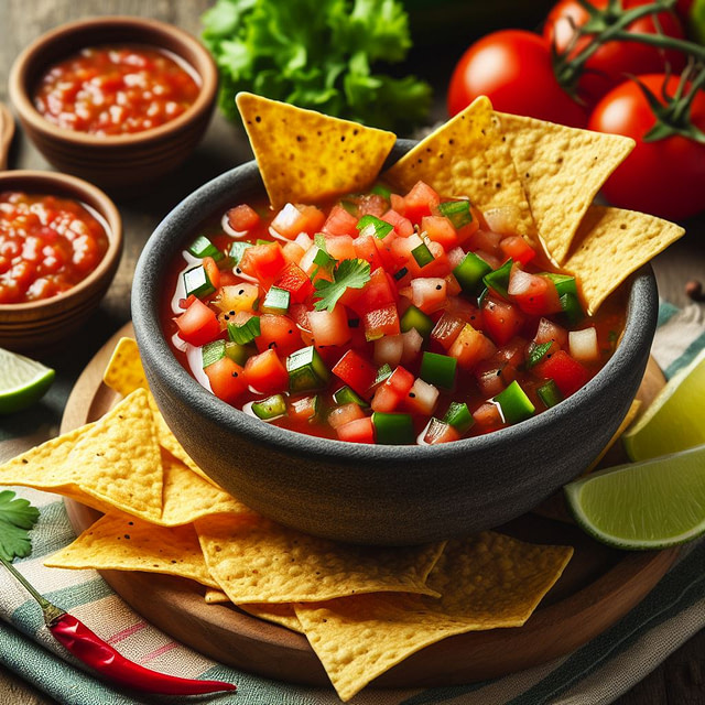 This fresh and tangy salsa is a medley of ripe tomatoes, crisp onions, zesty lime, and fragrant cilantro, offering a taste of Mexico’s rich culinary tradition.