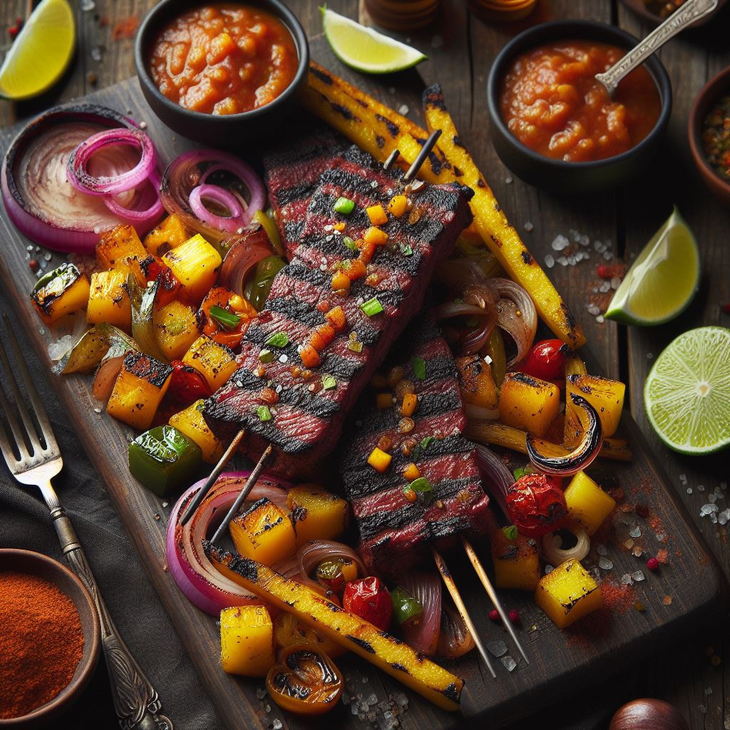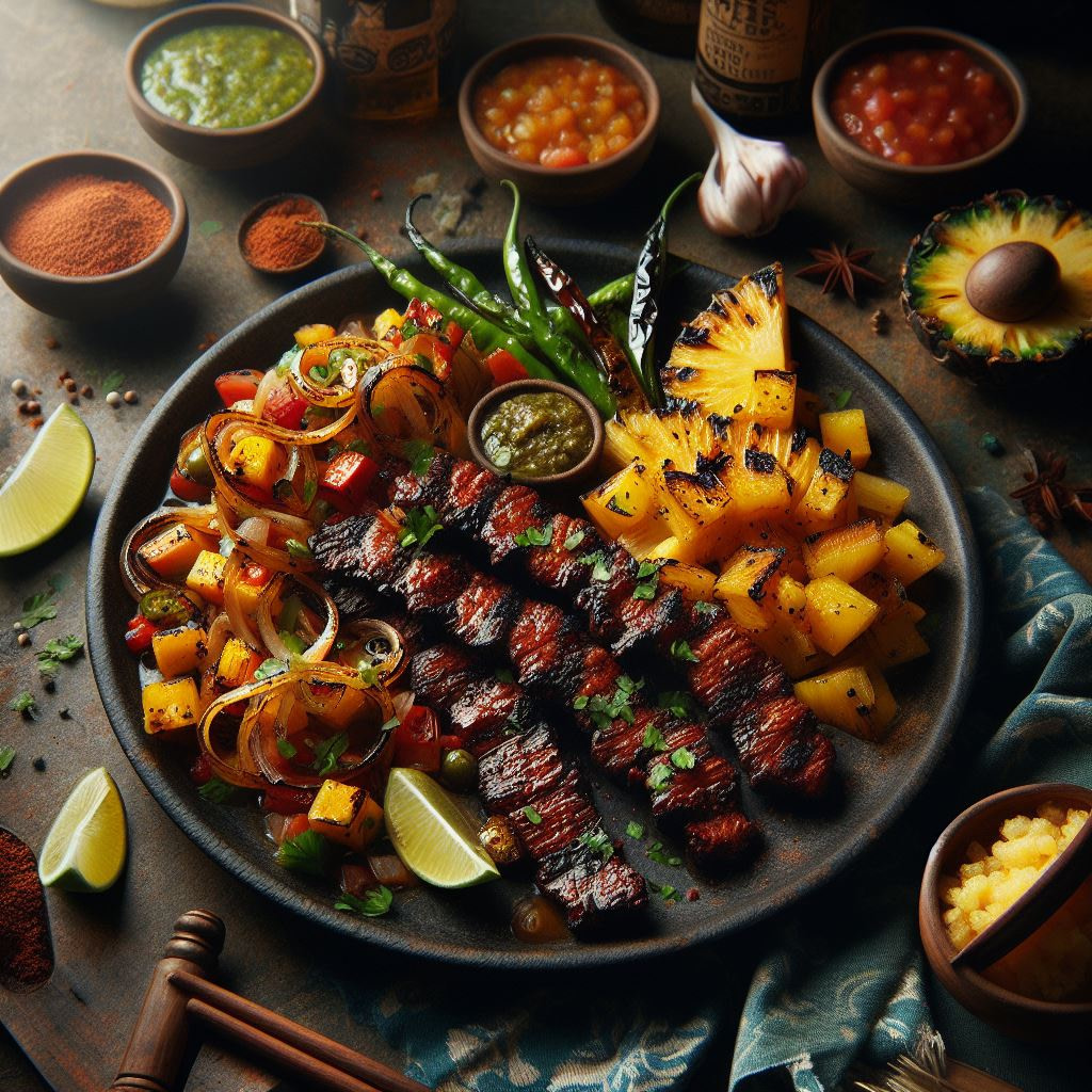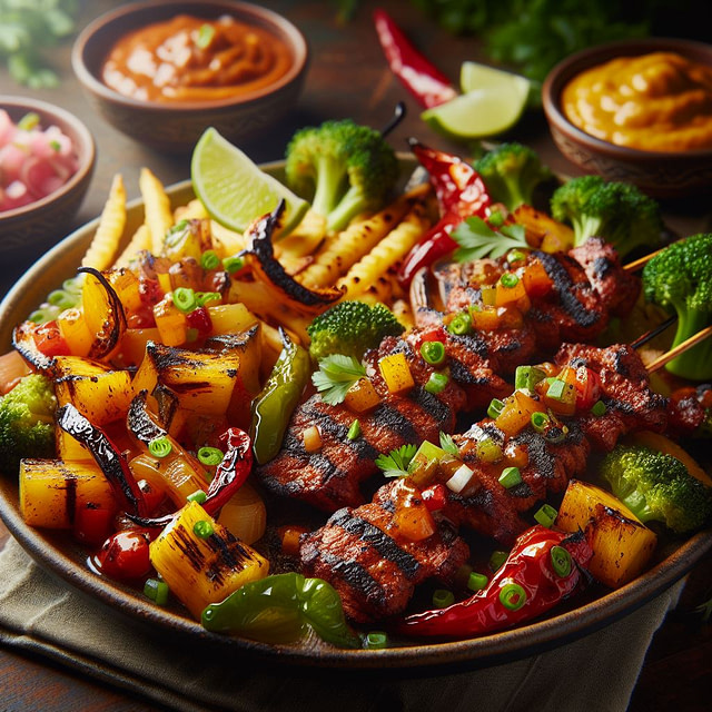 A symphony of smoky, sweet, and spicy flavors erupts in this artistic take on classic fajitas. Achiote paste and chipotle peppers infuse chicken with earthy warmth, while charred pineapple salsa bursts with tropical vibrancy. Grilled red onions and poblano peppers add depth and smokiness to complete the fiesta.